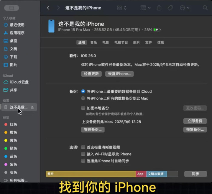 打开“访达”(Finder),在左侧栏里找到你的iPhone。