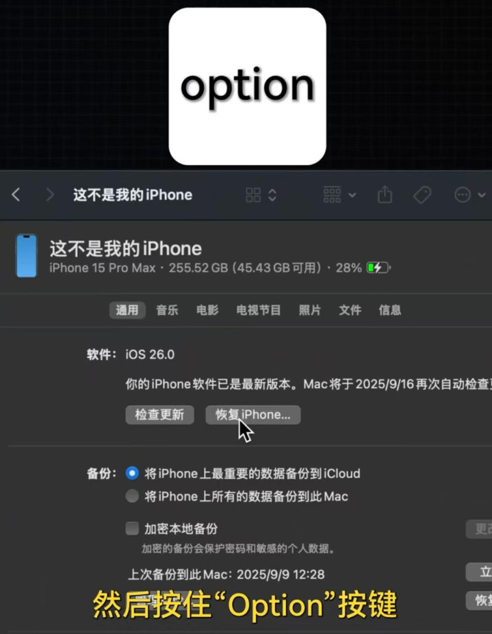 死死按住Option键不放,同时用鼠标点击屏幕上的“恢复iPhone”按钮。