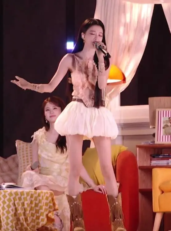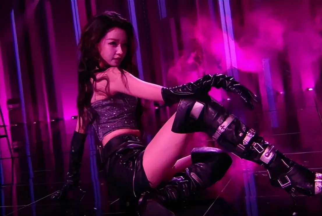 初舞台时她的造型又美又飒,粉色的灯光打在她身上带着一丝暧昧,即使穿着过膝的皮靴,大长腿也丝毫不会被忽视。