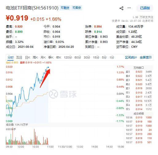 4月21日,新能源板块再度走强。截至10时58分,电池ETF招商(561910) 放量上涨1.44%,盘中最高涨幅达1.77%。成分股方面,德福科技、珠海冠宇、震裕科技、恩捷股份、多氟多、天赐材料等涨幅居前,板块呈现普涨格局。
