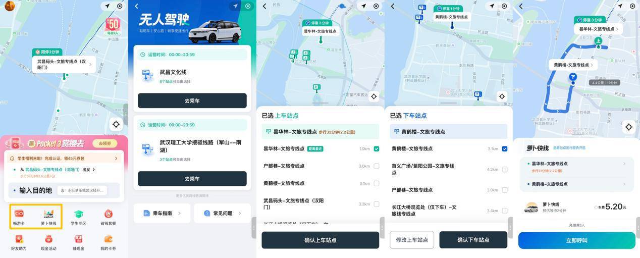 “萝卜快线”深度整合城市文旅资源,针对不同城市特色打造专属专线。武汉专线将黄鹤楼、户部巷、昙华林等核心文旅点位串联起来,让游客一站式解锁人文、美食与江景,省心又省力;佛山顺德专线主打“寻味大良文旅快线”,连接顺峰山公园、欢乐海岸 PLUS 等地标,无缝衔接地铁口、商圈、酒店与特色美食店,实现吃住行游一体化;海口专线从骑楼老街到天空之山驿站,融合百年南洋风情与滨海艺术地标;上海专线无人驾驶环世纪公园,是区域内唯一的无人驾驶公园环游专线,周末运营,景观优美,满足亲子、情侣、研学等多种出行需求。